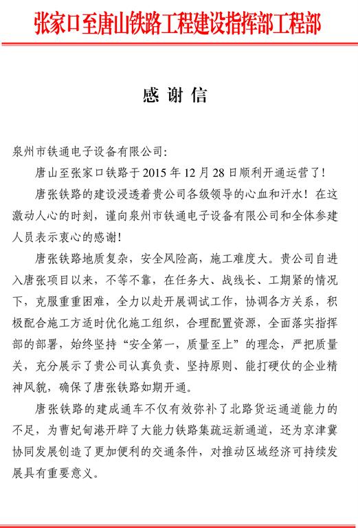 北京鐵路局張?zhí)畦F路工程建設(shè)指揮部工程部向我司發(fā)來感謝信