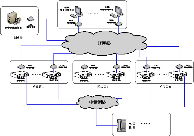 數(shù)字語音記錄儀系統(tǒng)主要由語音記錄儀、查詢終端、網(wǎng)管服務(wù)器及調(diào)制解調(diào)器等組成。